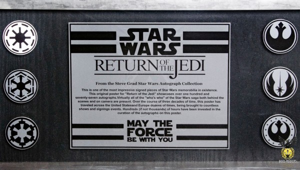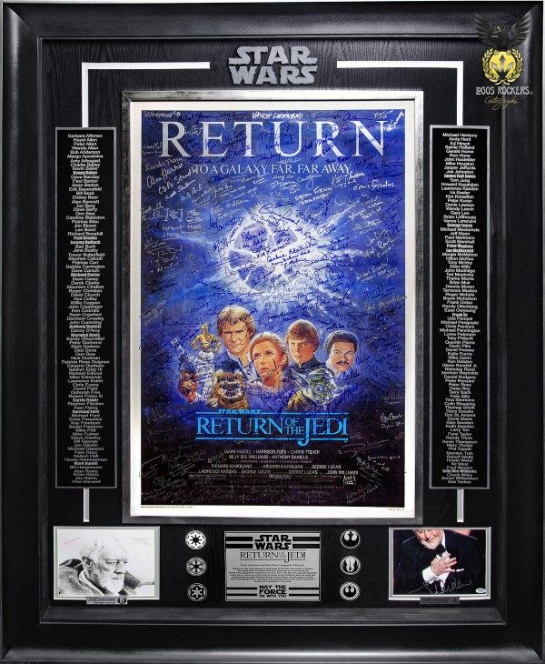 El impacto visual de este póster es dramático para el ojo del coleccionista pero quizás el aspecto más impresionante es el tiempo invertido para obtener una pieza tan notable. A lo largo de tres décadas, este póster ha viajado por Estados Unidos y Europa decenas de veces, y ha sido llevado a innumerables espectáculos y eventos de firmas de autógrafos. Se han invertido cientos, si no miles, de horas en la recolección de los autógrafos de este poster. Y ahora, sin más demora, aquí estan algunos de los nombres de las celebridades que plasmaron su autógrafo en este póster: Anthony Daniels, Billy Dee Williams, Carrie Fisher, David Prowse, Denis Lawson, Felix Silla, Frank Oz, George Lucas, Harrison Ford, Howard Kazanjian, Ian McDiarmid, James Earl Jones, Jeremy Bulloch, Ken Colley, Kenny Baker, Lawrence Kasdan, Margo Apostolos, Mark Hamill, Michael Carter, Michael Mackenzie, Paul Brooke, Peter Mayhew, Peter Ross, Warwick Davis & 154 celebridades, artistas y colaboradores más que dieron vida a este importante film que marco las bases del cine de ciencia ficción.