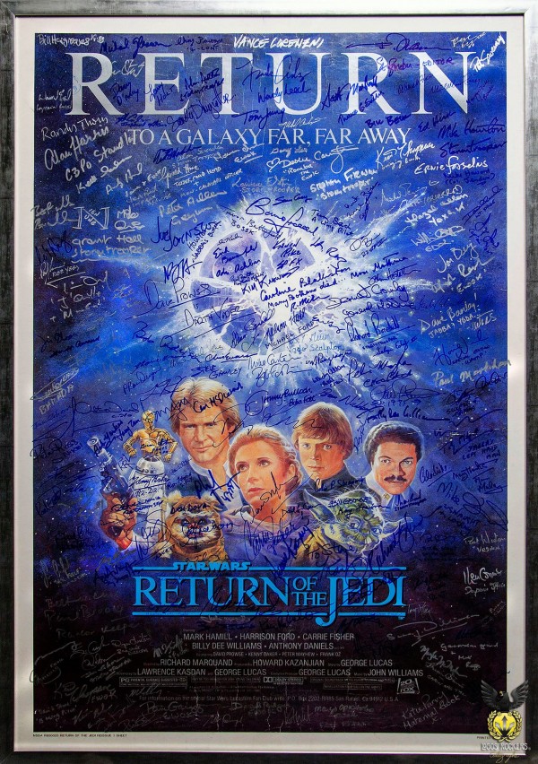 Póster original Lucasfilm de 27x 41 pulgadas impreso en USA de la película “Return of the Jedi” autografiado por 178 actores, directores, productores, prácticamente todos los participantes en la realización de este histórico film de la saga Star Wars, tanto detrás de escena como en cámara, están presentes.